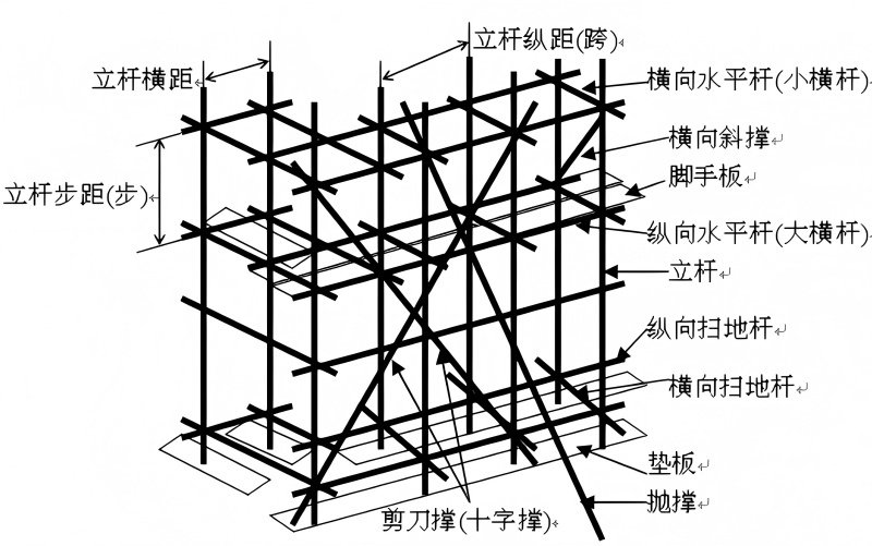 Planks usually erected with horizontal ledgers, vertical standards, and bottom braces, such as steel planks are connected to horizontal ledgers of ringlock or cuplock scaffolding through hooks, forming a modular system; wooden or bamboo planks ask for additional horizontal support bar for bearing and fixed by wire binding to prevent displacement.