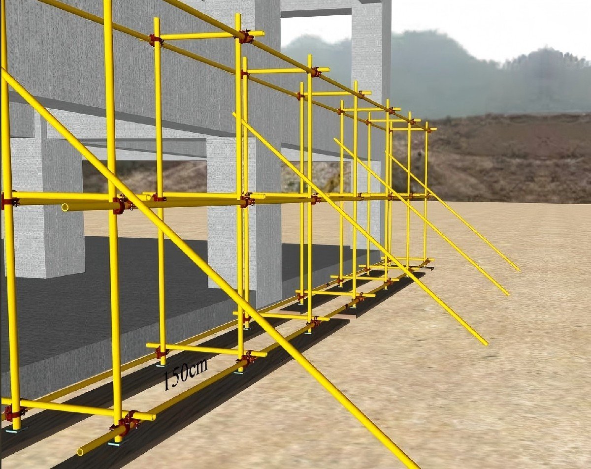 The lateral bracing is a supporting component used in the scaffolding system for temporarily stabilizing the structure. It is mainly used to prevent the scaffolding from overturning when it is impossible to set up wall connecting brace in time during the process of erection or dismantling. One end of lateral bracing is connected to the horizontal ledger or vertical standard, the other end is mounted on the ground in an inclined angle, thus forming a stable triangular structure, it temporarily bears the horizontal thrust and vertical load of the overall frame, preventing the scaffold from overturning.